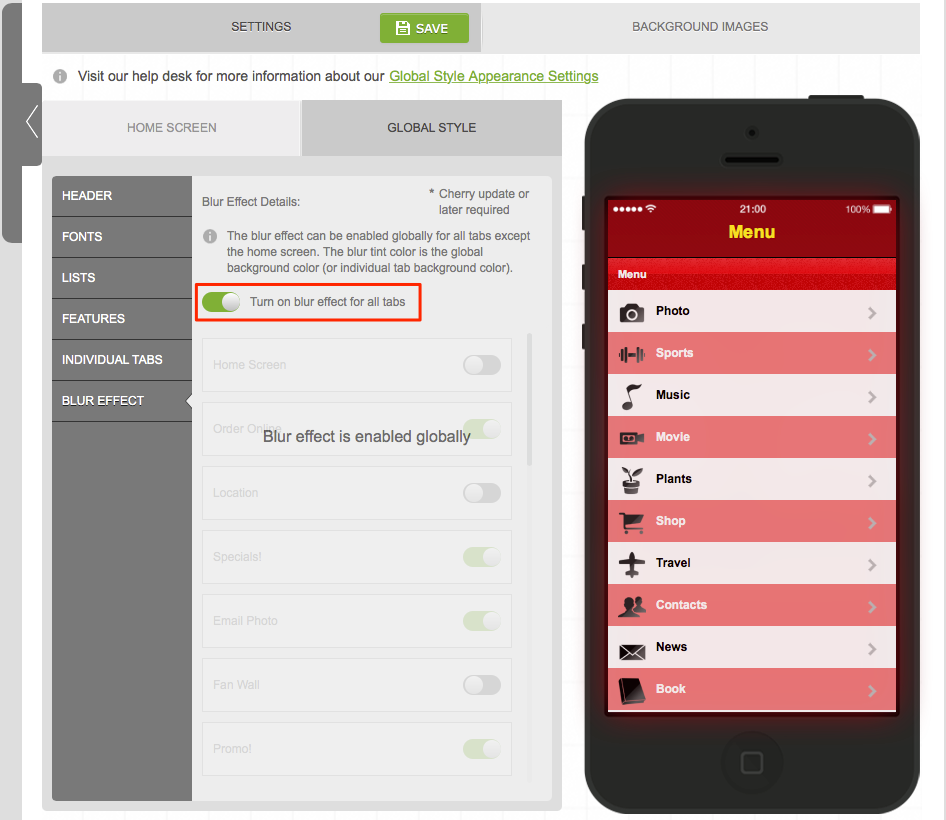 Head over to the Appearance Step -> Settings. Under Global Settings you will now see a new option titled Blur Effect. Here you have a couple options.