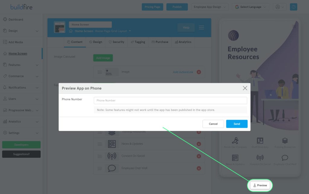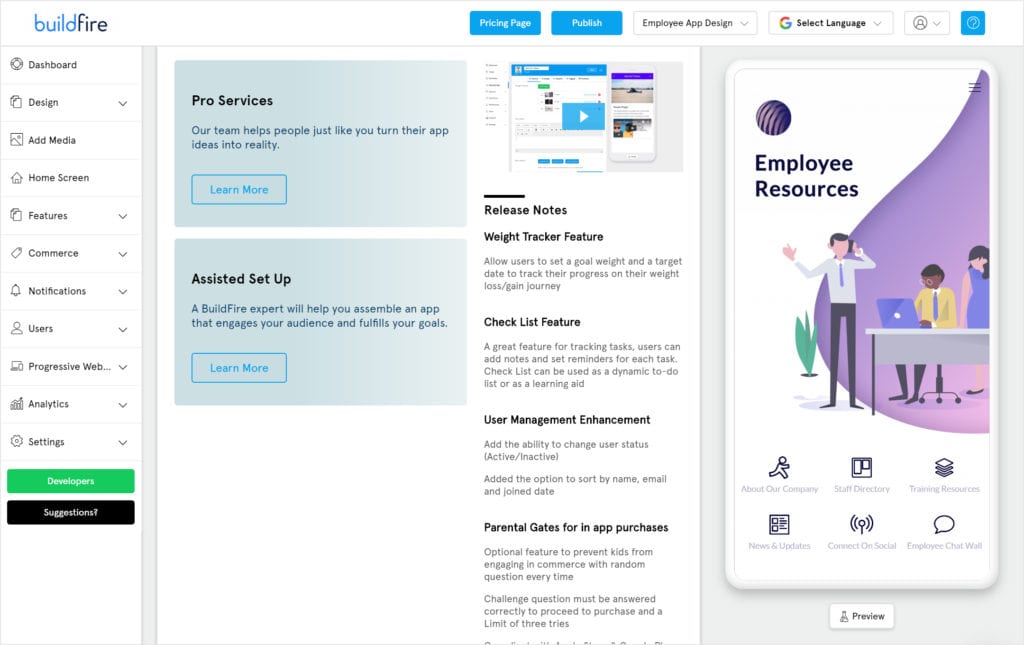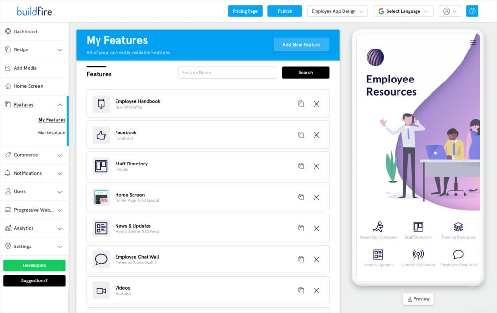 It’s no secret that the world has gone mobile. We’re living in an era where our smartphones are within an arm’s reach at all times, day or night. What’s everyone doing on those devices? Using mobile apps. The potential use cases for mobile apps are seemingly endless. Mobile apps are not just made for general consumers. Businesses can leverage mobile apps for a wide range of internal uses—including employee communication. Internal employee communication apps are ideal for companies with a deskless workforce, remote employees, field service workers, or departments that are isolated from one another. Apps make it easy for employees to communicate with each other and find useful information without having to call headquarters or human resources. Take a moment to assess your current process for internal employee communication. How does a remote worker contact someone in another department? How can a field service employee access your company directory? Is your process efficient? In most cases, employees are forced to call a general helpline to connect with their co-workers. A receptionist or someone in the HR department has to either transfer the call accordingly or relay the necessary contact information. It’s a time-consuming process and labor-intensive for everyone involved. But an internal communication app gives everyone the ability to reach anyone in the company instantaneously, at their fingertips, from anywhere. In addition to the direct communication features, an app can give your staff a wide range of other employee resources. Management can use the app to send out company news and updates. Staff can access training materials and employee handbooks on the go. Tasks that would normally require a five or ten minute phone call and multiple points of contact can be completed in seconds. Ultimately, creating a workforce app saves time, money, and improves the efficiency of basic tasks—especially for internal communication. Whether your organization has 20 employees, 200 employees, or 2,000+ employees, you can benefit from building an internal workforce app. The best part? You can build an app on your own without any technical knowledge or development experience. If you know how to navigate the Internet, you can create an app with BuildFire. Table of Contents This guide will walk you through the step-by-step process of building an employee app using BuildFire. While the guide reads best from top to bottom, feel free to use the clickable navigation to jump between sections. Some of you might be further along in the building process than others. Here’s what we’re going to be building: Setting up the Navigation for Your App Creating Functionality and Adding Features Previewing Your App and Publishing to the App Store First, sign up and create an account. Before you do anything, you’ll need to create your BuildFire account. Just go to BuildFire.com and navigate to the “Build an Appâ€? button in the top right corner of the page. You can also click here to sign up and get started. You’ll be presented with multiple ways to build an app—BuildFire DIY, White Glove Setup, or BuildFire Reseller. For the purposes of this tutorial, select BuildFire DIY to build an app on your own. The first step to creating an account is choosing a template. If you’ve ever designed a website on your own using a site builder, the same concept is applied here. Rather than starting out with a blank canvas, you can simply browse through the various templates that we have. These templates already have some design and structure built-in. Find something that’s suitable for your branding and app purpose. Browse by category on the left side of the screen. Whenever you click on a template, the app preview on the right side of the screen will adjust in real-time. Once you select a template, continue to fill out the form fields on the screen to complete the account creation process. What is BuildFire? For those of you who are new and unfamiliar with us, I just want to take a moment to quickly describe our product. BuildFire is a platform that allows people to build mobile apps with no coding required. You’ll create the app using modular units of app functionality called plugins. If you’re looking for a feature that you don’t see on our marketplace, you can create advanced functionality with the BuildFire SDK. How to navigate the BuildFire control panel: Using BuildFire is easy. Simply use the emulator to navigate around your app. Any time you add a feature or make custom changes, everything will be updated in real-time. Whenever you click on an app page or feature on the right side of the screen, the corresponding configuration will be loaded in the center of the control panel. You can also navigate to the “My Featuresâ€? menu on the left side of the dashboard and locate specific features in there. To add functionality to your app, just add a plugin. These units of functionality can easily be applied to your app with a single click. Simply browse the marketplace to search for features. All you have to do is create the feature and then link to it. You can link to features from your home screen, side menu, sticky footer, or any other clickable area of your app to make it accessible. There are certain core features that every app should be using, regardless of your industry, use cases, or primary app function. Those features include in-app purchases, push notifications, and user login. Now that you have a basic understanding of how BuildFire works, let’s get started building your app with a quick win. The easiest way to start building your app is with the home screen. Your home screen is the first thing that users will see when they log in, so it should link to the most important features of your app. Home screens will serve as the primary navigation page for the app. Top homepage layouts for an employee app: All of these home screen layouts are available in the marketplace. Once you ass
